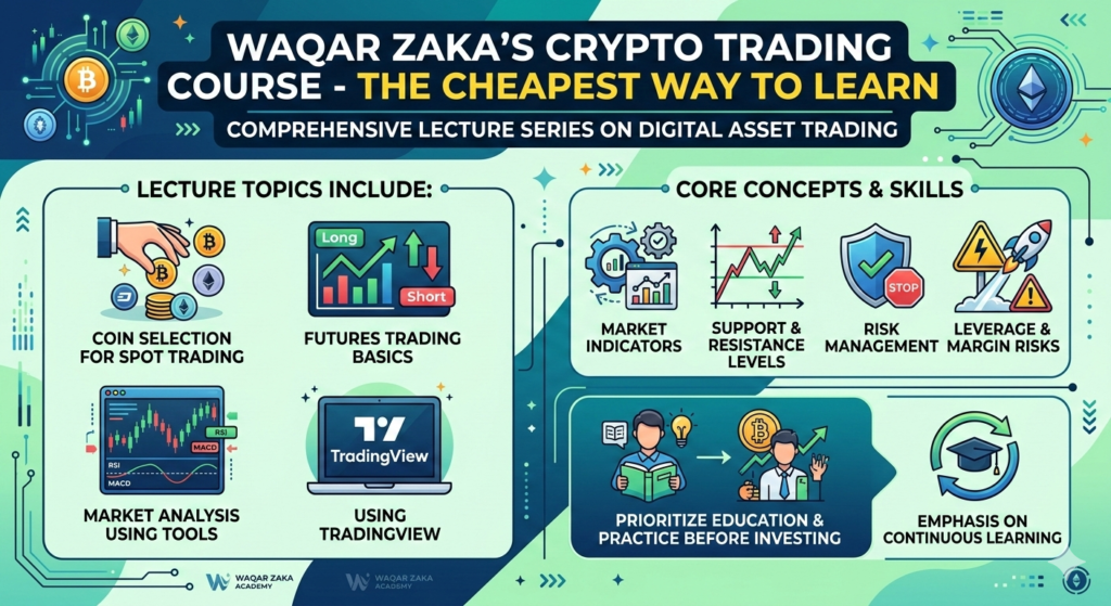 The Course outlines a series of lectures focused on cryptocurrency trading, covering topics such as coin selection for spot trading, futures trading basics, and the importance of practice and analysis using tools like TradingView. It emphasizes the significance of understanding market indicators, support and resistance levels, and the risks associated with leverage in trading. New traders are advised to prioritize education and practice before making investments.